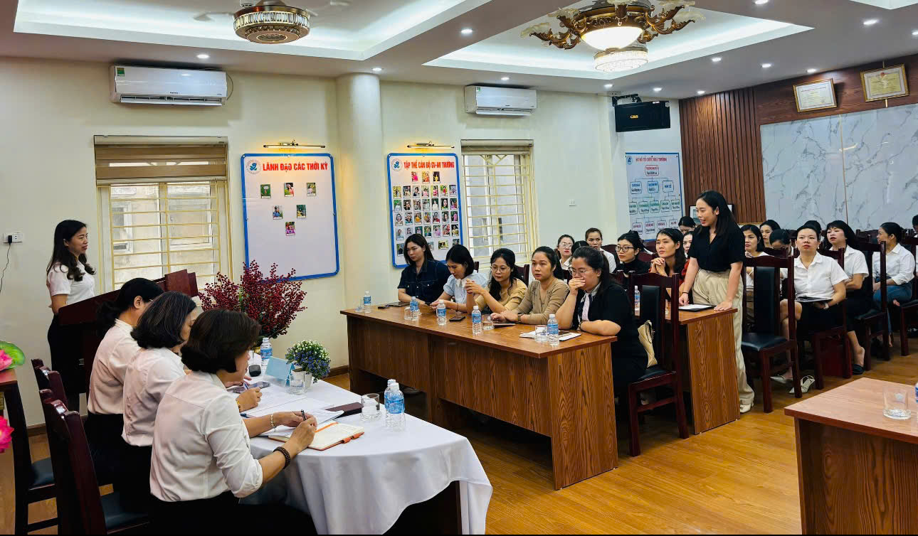 Đồng chí Nguyễn Thu Hiền - Bí thư Chi bộ, Hiệu trưởng nhà trường báo cáo khái quát kết quả thực hiện phối kết hợp giữa nhà trường với PHHS về công tác phối hợp với phụ huynh giáo dục lễ giáo và tăng cường hoạt động trải nghiệm cho trẻ.