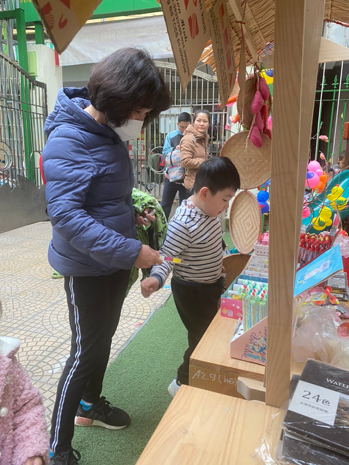 Ngày thứ 6 (17/2/2023) là ngày Hội chợ xuân. Lễ hội chợ xuân năm nay với một không gian chợ quê thu nhỏ được tái hiện trong chính khuôn viên nhà trường. Ở đó có nhiều mặt hàng truyền thống, các khối lớp đã lựa chọn những mặt hàng từ nhiều vùng miền khác như bánh đúc, bánh tẻ, bánh gio, bóng, xúc xích… tạo cơ hội cho các con được mở rộng sự hiểu biết của mình bằng những trải nghiệm thực tế. Thông qua Hội chợ xuân này, các con được hòa mình vào không khí xuân với các gian hàng phong phú, hấp dẫn, nhiều món ăn được các con yêu thích. Những túp lều nhỏ, những món ăn quê, một góc câu đối tất cả đều được các cô giáo và các con tự tay trang trí, chuẩn bị với mong muốn tạo cho các con cảm giác gần gũi về một phiên chợ quê truyền thống. Nhìn những khuôn mặt vui vẻ, ánh mắt ngập tràn niềm vui, mỗi bạn nhỏ không giấu được sự háo hức chờ bố mẹ đón để tham gia sự kiện tại trường. Các con rất thích thú và hạnh phúc khi được cùng bố mẹ trải nghiệm không khí Xuân đang về trên chính ngôi trường của các con. Được cùng gia đình vui xuân, lựa chọn những món ăn yêu thích và hạnh phúc hơn khi các con được vui vẻ bên gia đình trong không khí vui tươi của mùa xuân.
