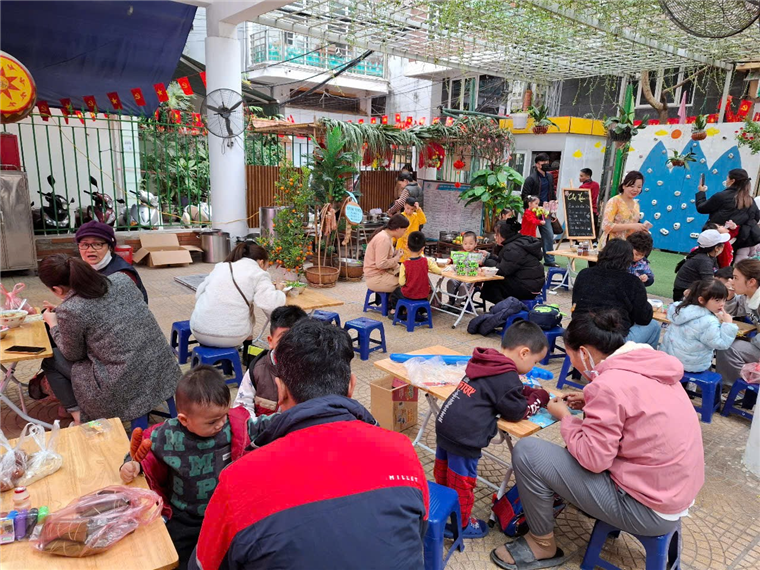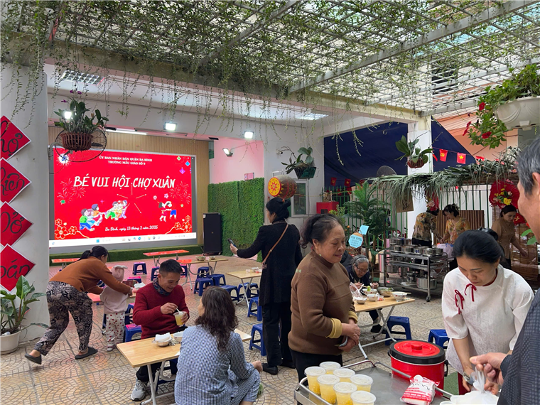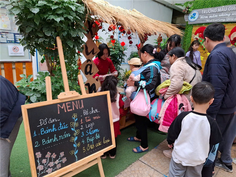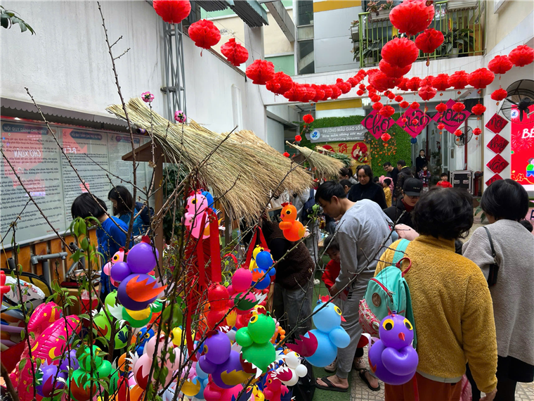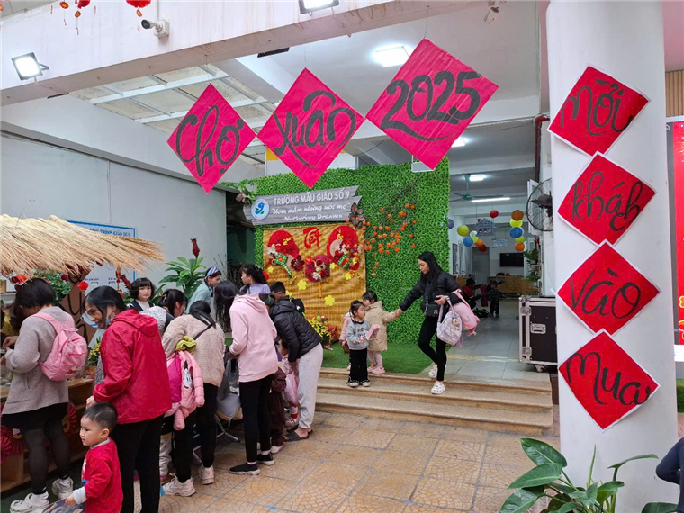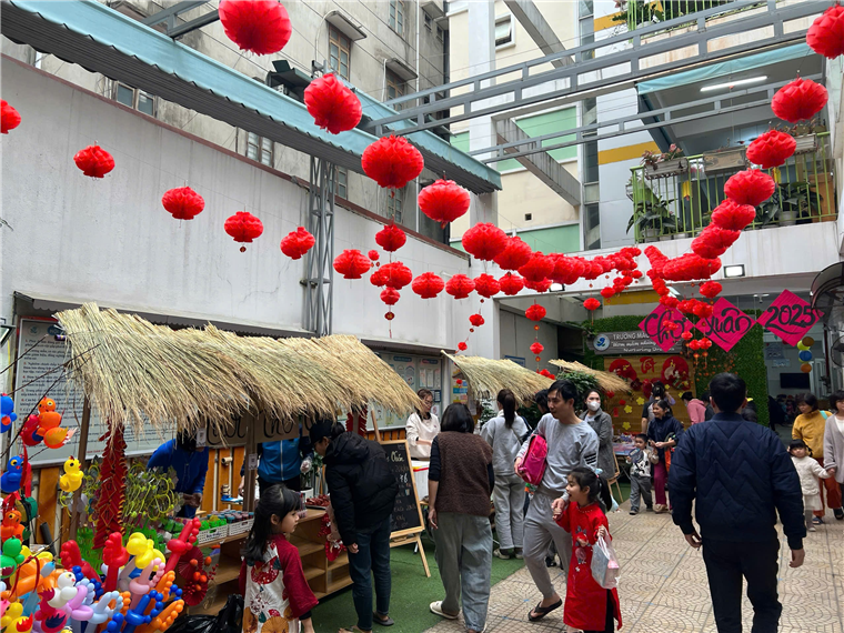 Bằng các nguyên liệu thiên nhiên gần gũi với trẻ như lá cọ, mành, mẹt…cùng các hình ảnh quen thuộc như tràng pháo, câu đối, …và những sắc hoa của mùa Xuân, tập thể nhà trường đã chuẩn bị cho khung cảnh của Hội chợ Xuân thật bắt mắt, độc đáo, không khí vui tươi tràn ngập khắp nơi. Cả sân trường ngập tràn trong sắc xuân với những gian hàng rực rỡ màu sắc.